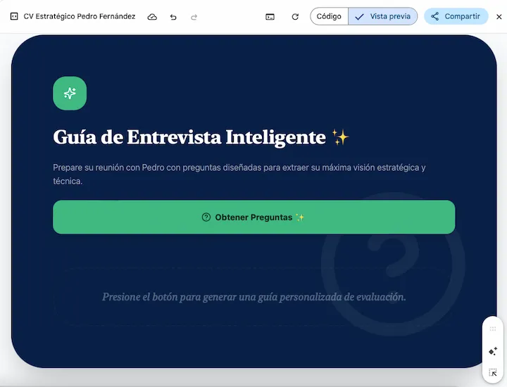 - «Simulador de Encaje ✨»: El reclutador pega su descripción de puesto y la IA puntúa la afinidad de Pedro con el rol.